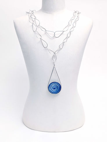 The Water Necklace is a six foot chain of graduated hand made silver links attached to a vitreous enamel medallion. The drop-shaped links form a chain emulating a river. When worn, the links reorient themselves moving from a curve to a point and back again. The design on the surface of the medallion recalls the ripples made when a drop of water hits a surface of water.
